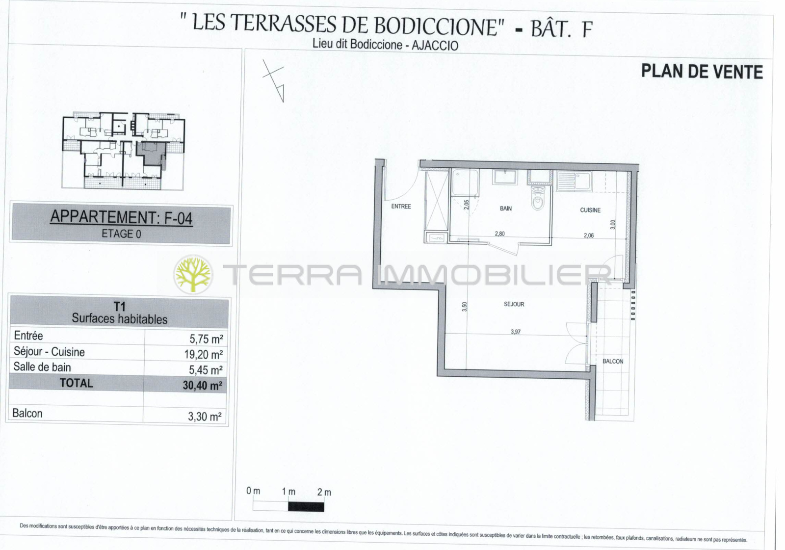 Terra Immobilier vous propose à la location à l'année un studio neuf de 30,40 m² situé au 1er étage avec ascenseur, Résidence Les Terrasses de Bodiccione à AJACCIO. Il comprend un hall d'entrée de 5.75 m² avec placard aménagé, un séjour de 19 m² avec cuisine équipée de rangements, plaque de cuisson et hotte, d'une salle d'eau avec WC, d'un balcon de 3.30 m².