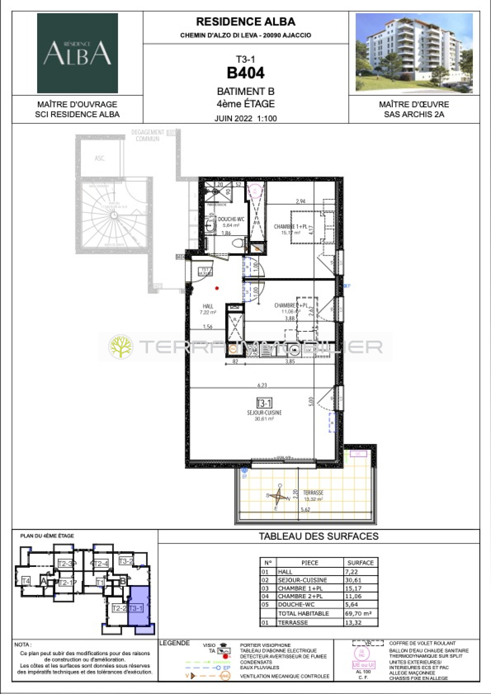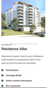 Votre agence TERRA IMMOBILIER a le plaisir de vous présenter dans une résidence à taille humaine et sécurisée située sur la Rocade, chemin d'Alzo di Leva, cet appartement de type t3 de 69,70m2 + terrasse de 13m2 au 4ème étage de la résidence ALBA.