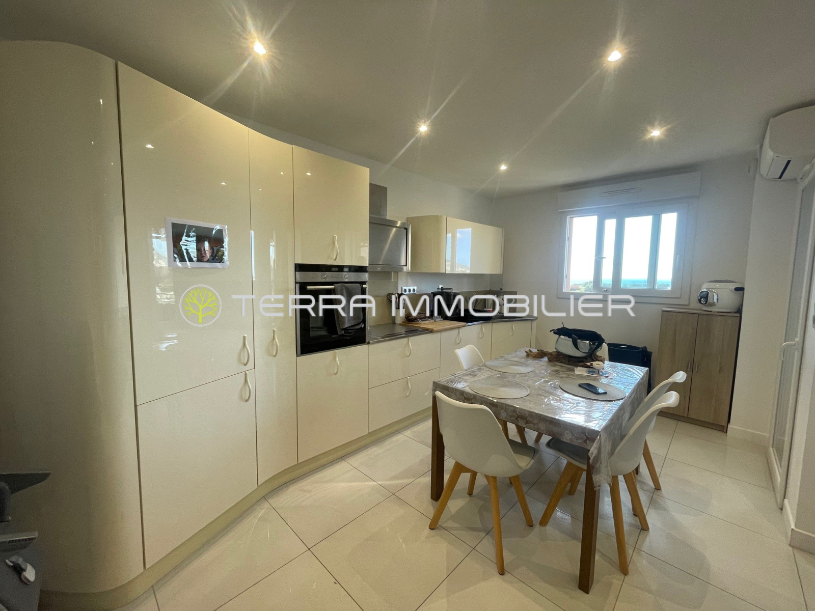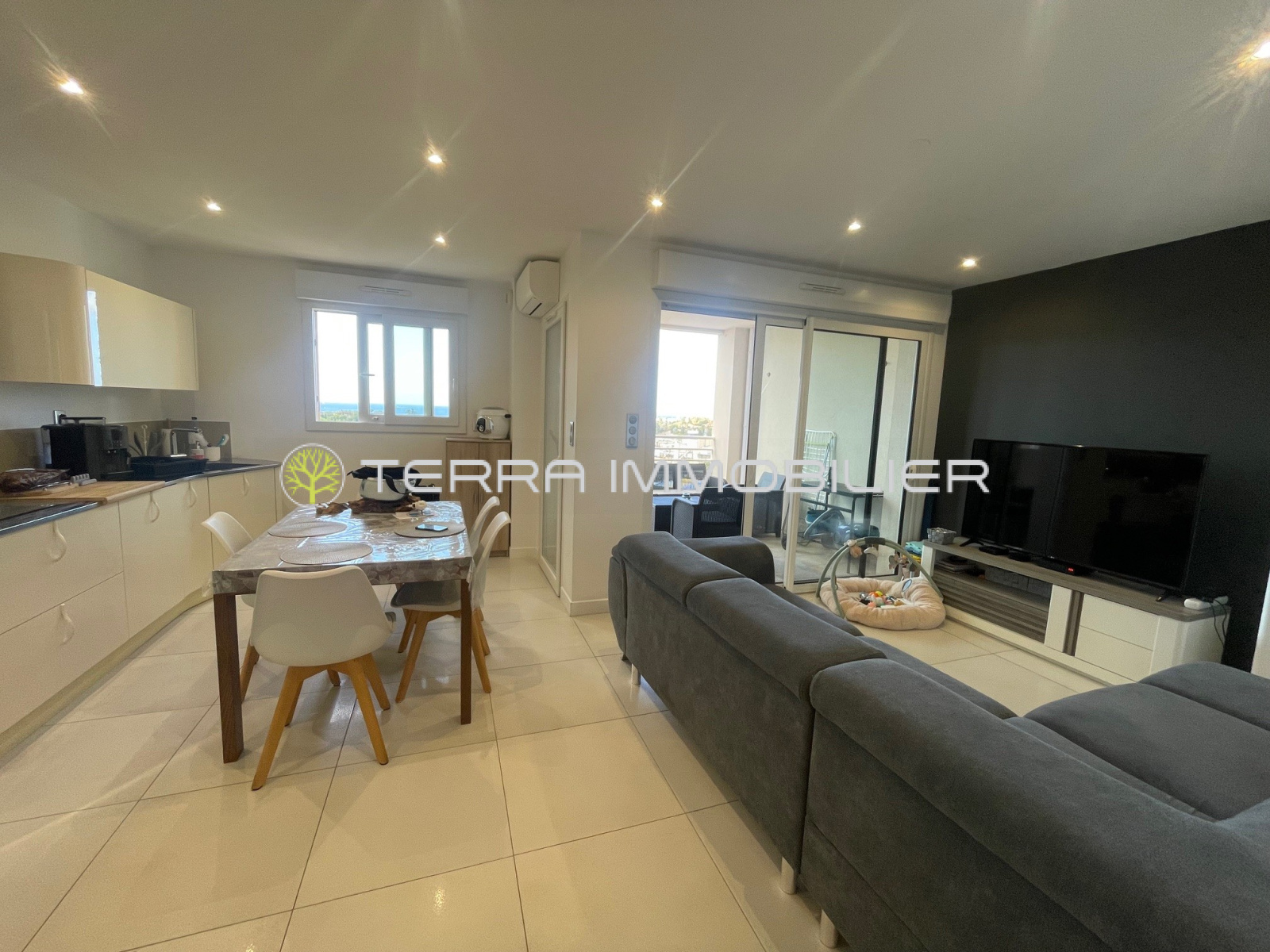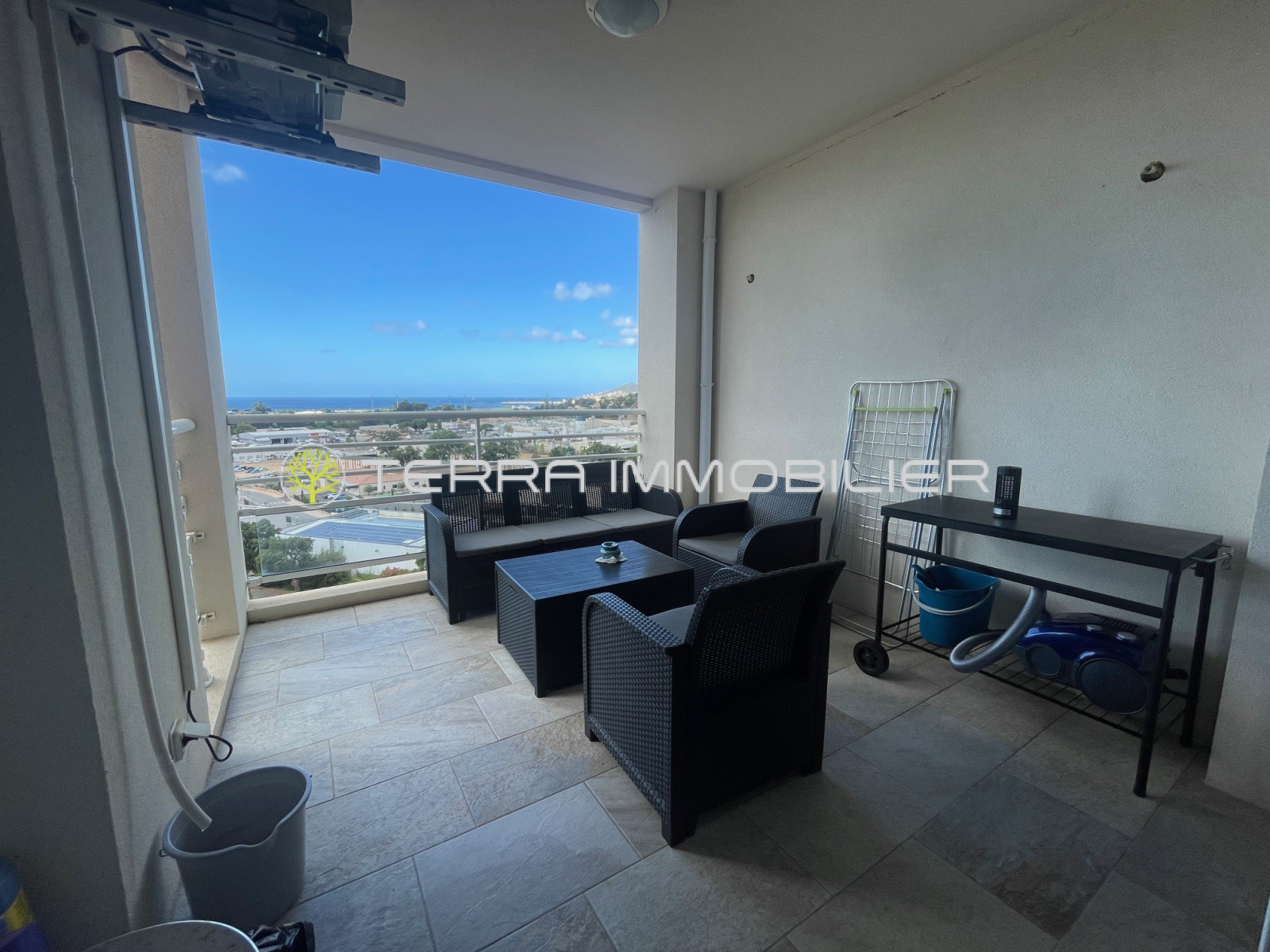 L'appartement dispose d'une entrée avec placard, d'une spacieuse pièce principale avec une très belle cuisine équipée donnant sur la terrasse, d'une salle d'eau avec toilettes et d'une grande terrasse avec vue mer.