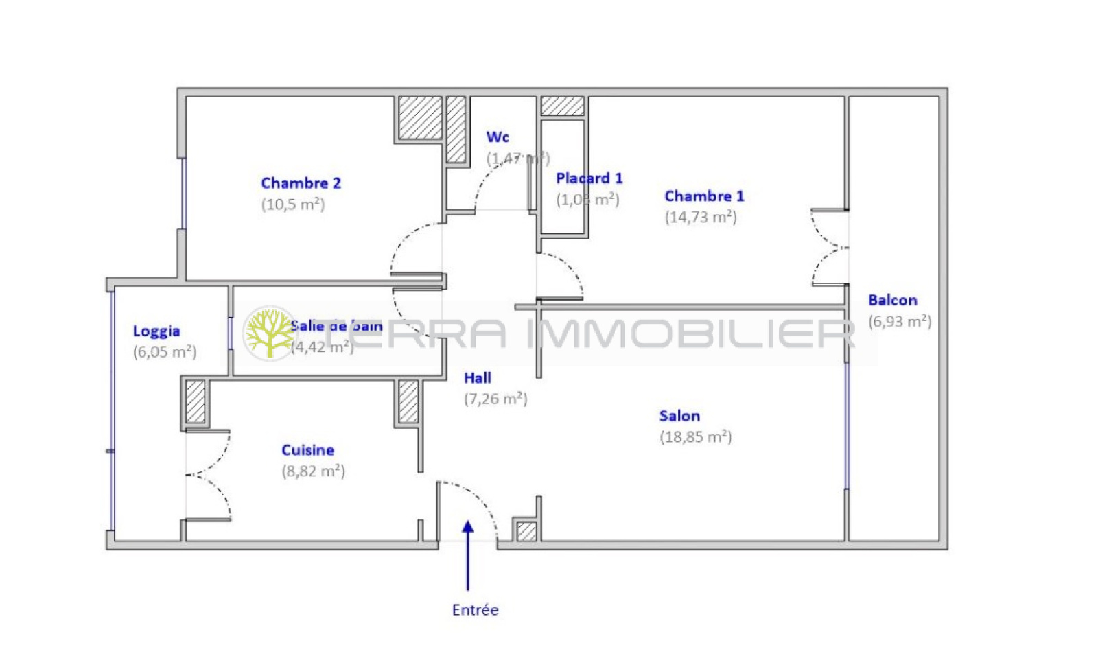 L'appartement est composé d'un hall d'entrée, d'un séjour ouvert sur le balcon , d'une cuisine équipée indépendante ouverte sur une loggia fermée, de deux confortables chambres avec placards, d'une salle de bains, d'un wc invité ainsi qu'une cave.