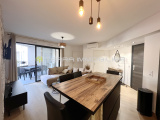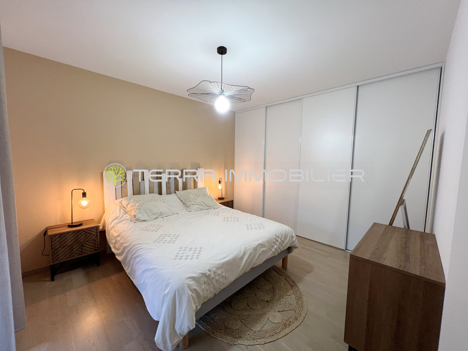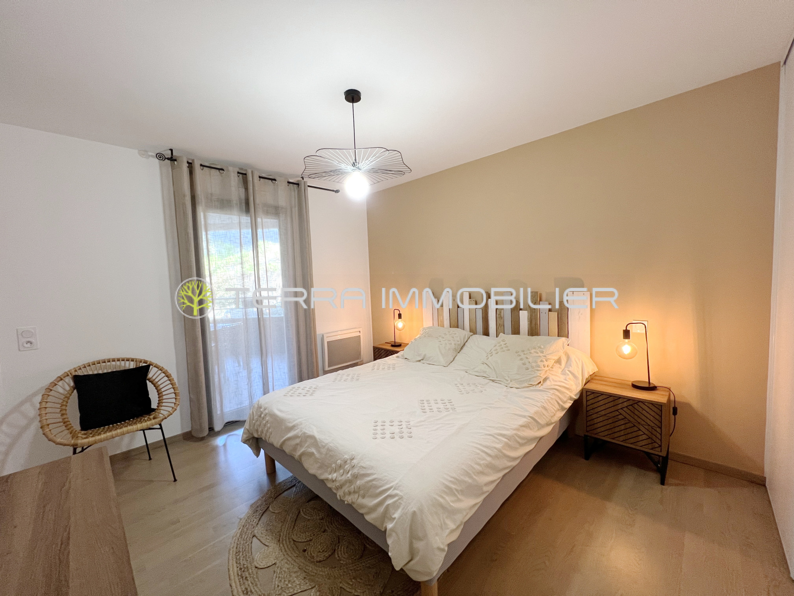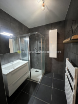 L'appartement se compose d'une pièce à vivre avec cuisine équipée ouverte sur la terrasse de 11m² de deux chambres avec placards aménagés, d'une salle d'eau et d'un WC invité.