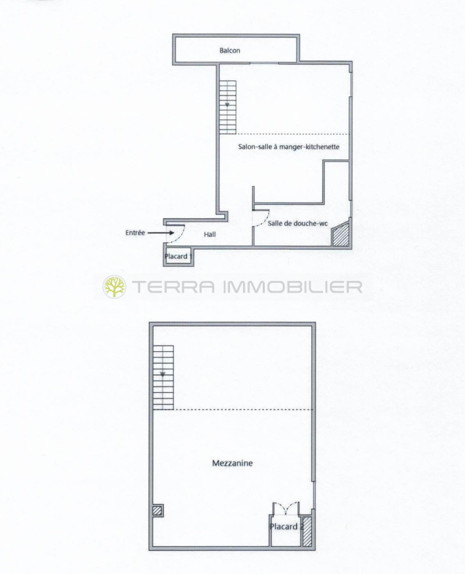 Il est composé d'un dégagement avec rangement, d'un séjour avec espcace cuisine, d'une chambre en mezzanine, d'une salle d'eau avec WC.