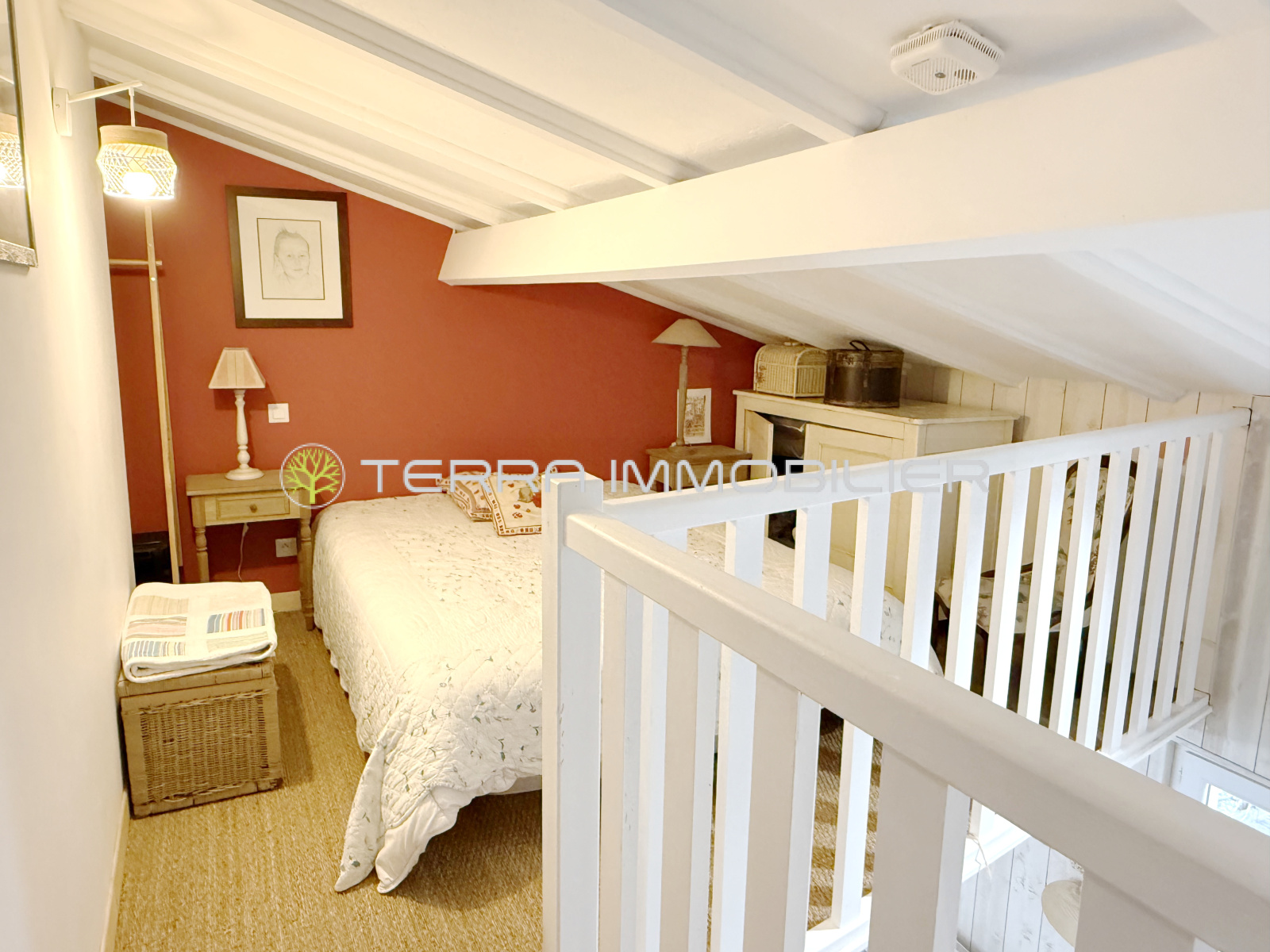 A l'étage : une mezzanine faisant office de deuxième chambre et une chambre avec placard.