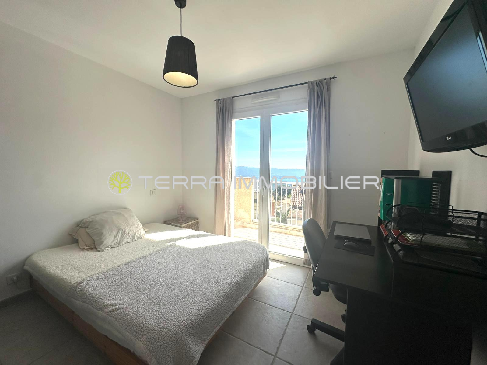 À l'étage, trois chambres avec placards ouvertes sur un balcon surplombant le village vue montagne et mer, un bureau ou dressing selon vos besoins ainsi qu'une grande salle d'eau/WC.